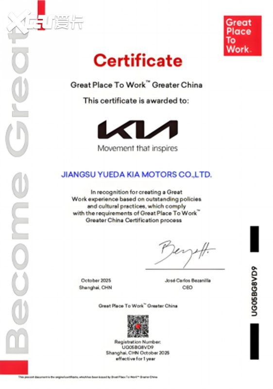 值得关注的是,在行业极度内卷的背景下,悦达起亚积极推进组织文化变革,构建了企业与员工和谐共生、双向赋能的职场生态,深入践行“以人为本”的长期主义发展理念。凭借在职场文化、人才梯队、员工关怀等领域的卓越实践,悦达起亚以93%的员工信任指数,高分荣获全球权威职场文化评估机构——Great Place To Work® (卓越职场研究所)颁发的“卓越职场”认证,成为2025年中国汽车行业唯一获得此项殊荣的汽车企业。