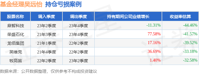 吴远怡管理的广发北交所精选两年定开混合A基金在23年2季度买入鼎智科技,在持有2个季度后在23年4季度卖出。持有期间的估算收益率为-44.46%,持有期间鼎智科技在2022年到2023年的年报营业总收入降幅为11.31%。
