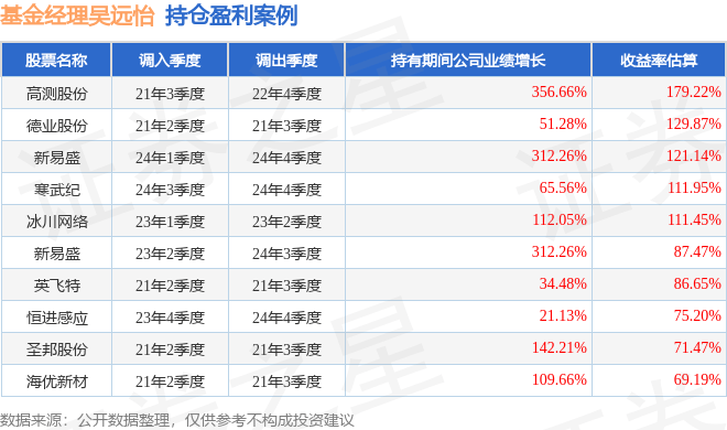 吴远怡管理的广发价值核心混合A基金在23年2季度买入新易盛,在持有1年又1个季度后在24年3季度卖出。持有期间的估算收益率为87.47%,持有期间新易盛在2023年到2024年的年报归属净利润增幅达312.26%。