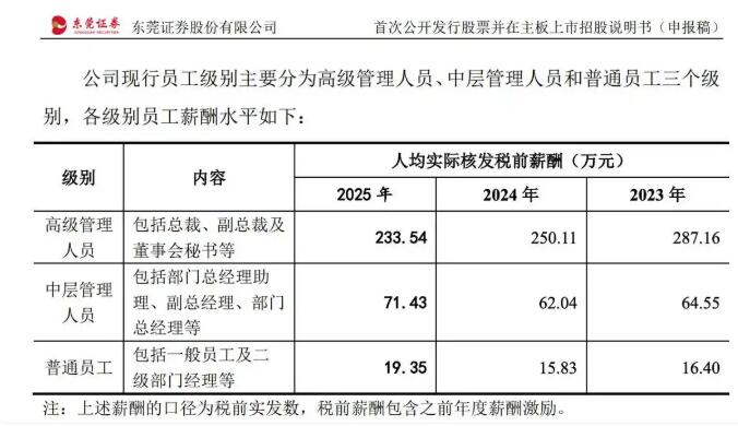 据每日经济新闻,在东莞证券的招股说明书中,公司对各级别员工和各岗位员工薪酬水平予以详细披露。总体来看,2025年东莞证券平均薪酬为24.21万元,同比增长17.87%。