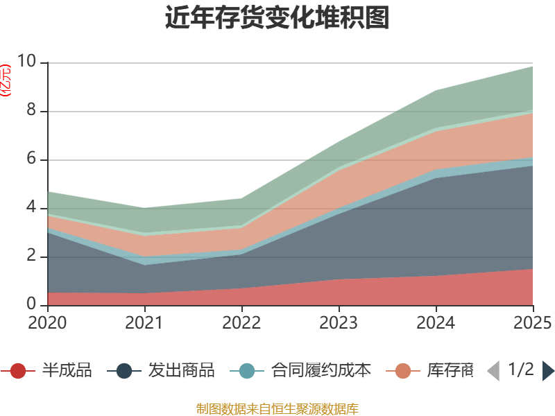 从存货变动来看,截至2025年末,公司存货账面价值为9.83亿元,占净资产的28.54%,较上年末增加9903.98万元。其中,存货跌价准备为3551.12万元,计提比例为3.49%。